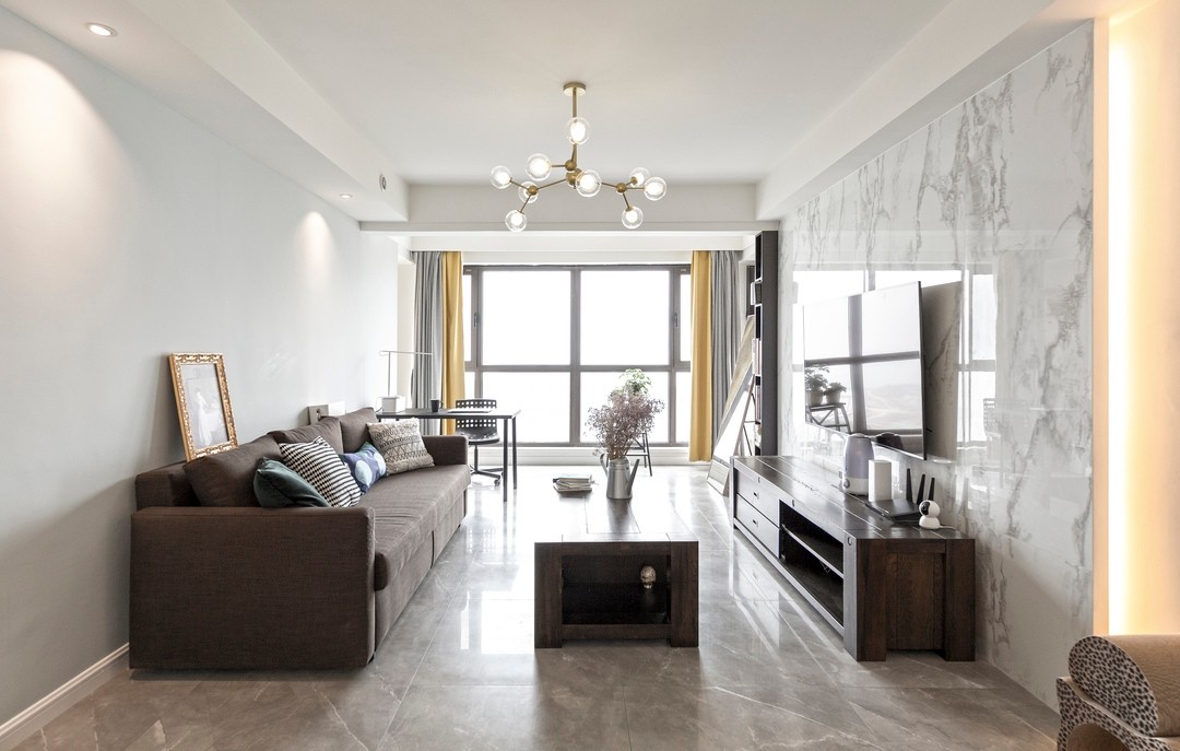 背景墙留了隐藏灯带,晚上可以打开,柔和的氛围光进入观影模式。