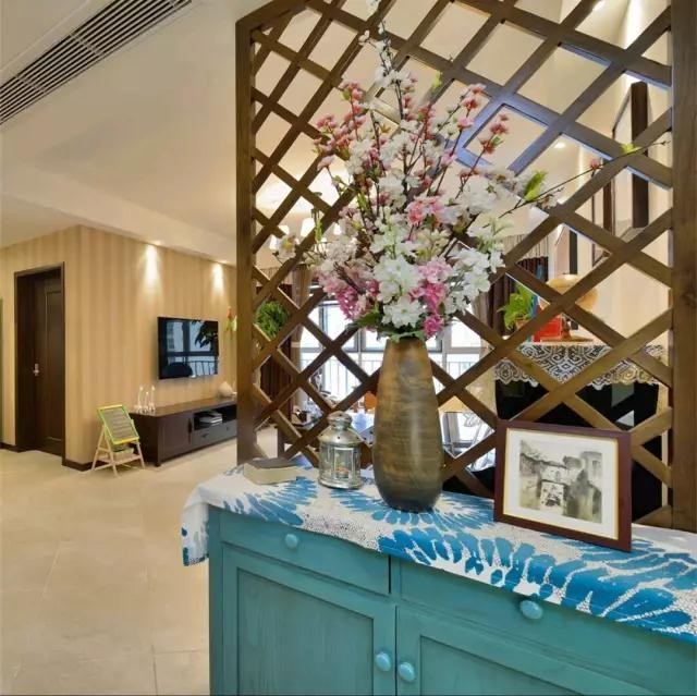 玄关用了屏风做隔断,散发出优雅的韵味。蓝色的玄关柜搭配装饰画与鲜花,看起来既文艺又有点小清新!