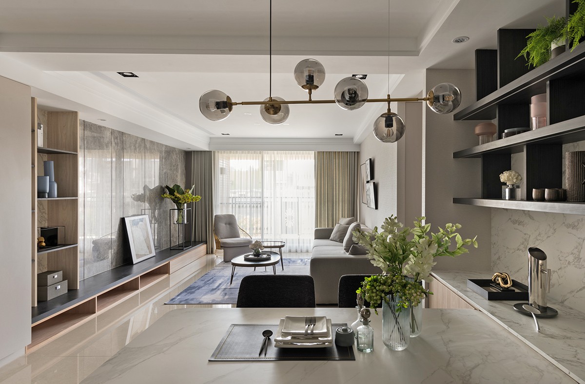 鑑于厨房坪数有限,工作檯面较少,因此大理石餐桌旁以等高平台推出餐边柜,予以摆放小家电,满足现代简易制作轻食点心习惯,并竖起木质高柜扩充厨房置物能力。