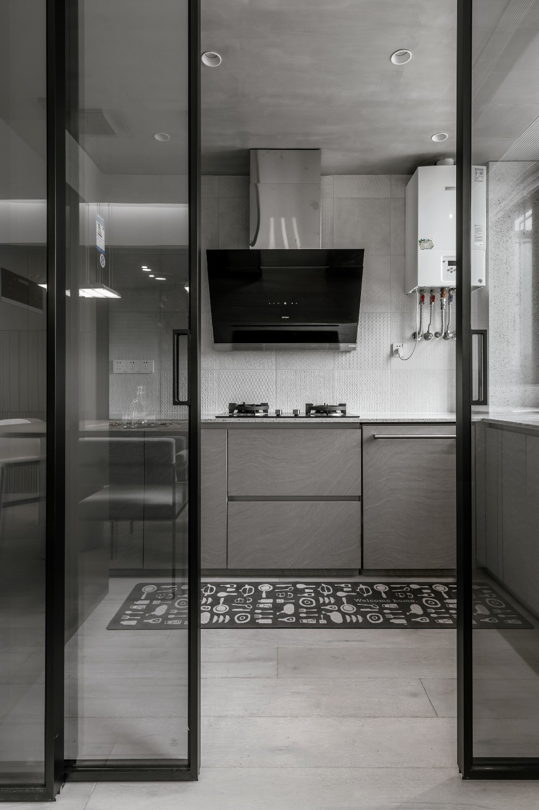 U型的操作台,动线设计一目了然,灰木色搭配白色的设计,同样以线条的方式表达简约,让厨房整体空间整洁利落。
