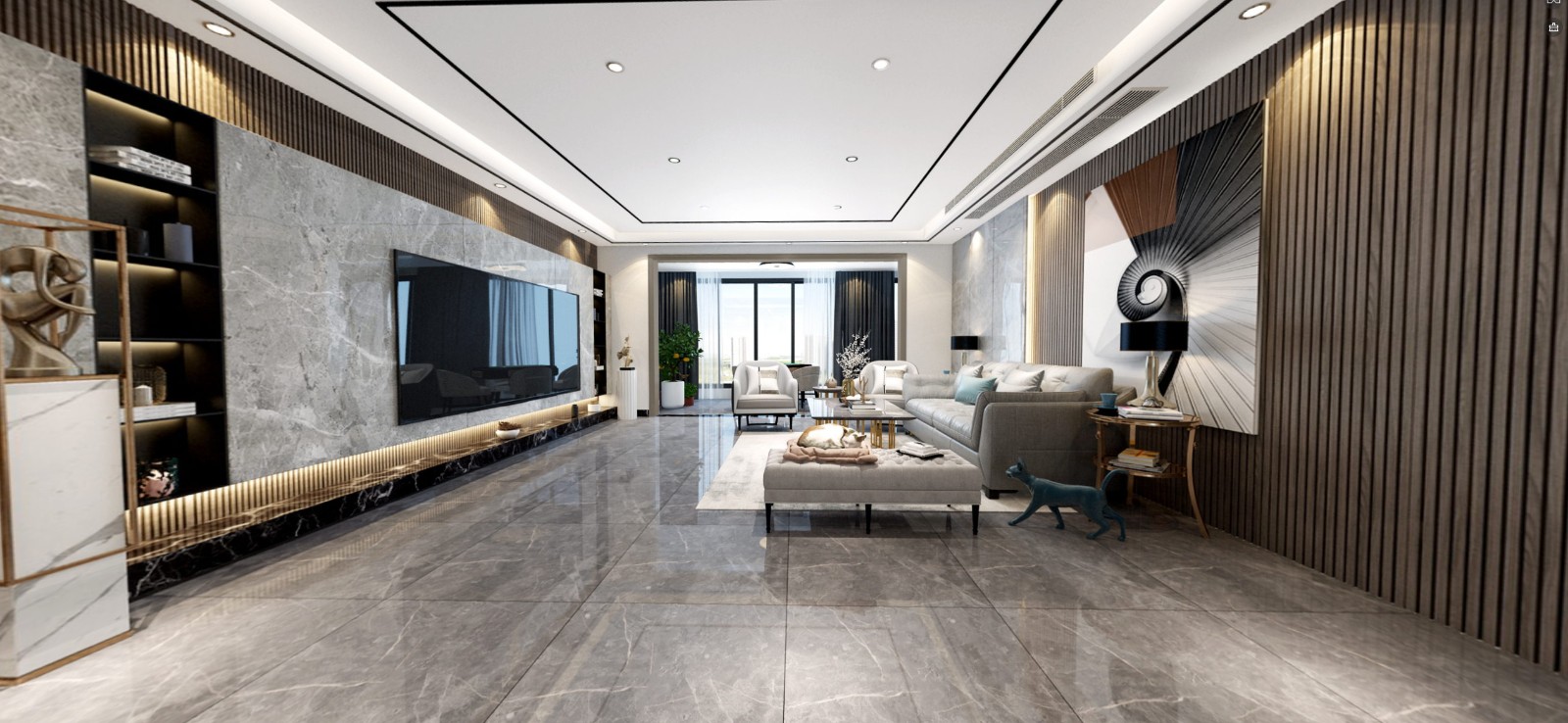 1·现代 无主灯吊顶 2.木饰面 3·石材 打造新空间