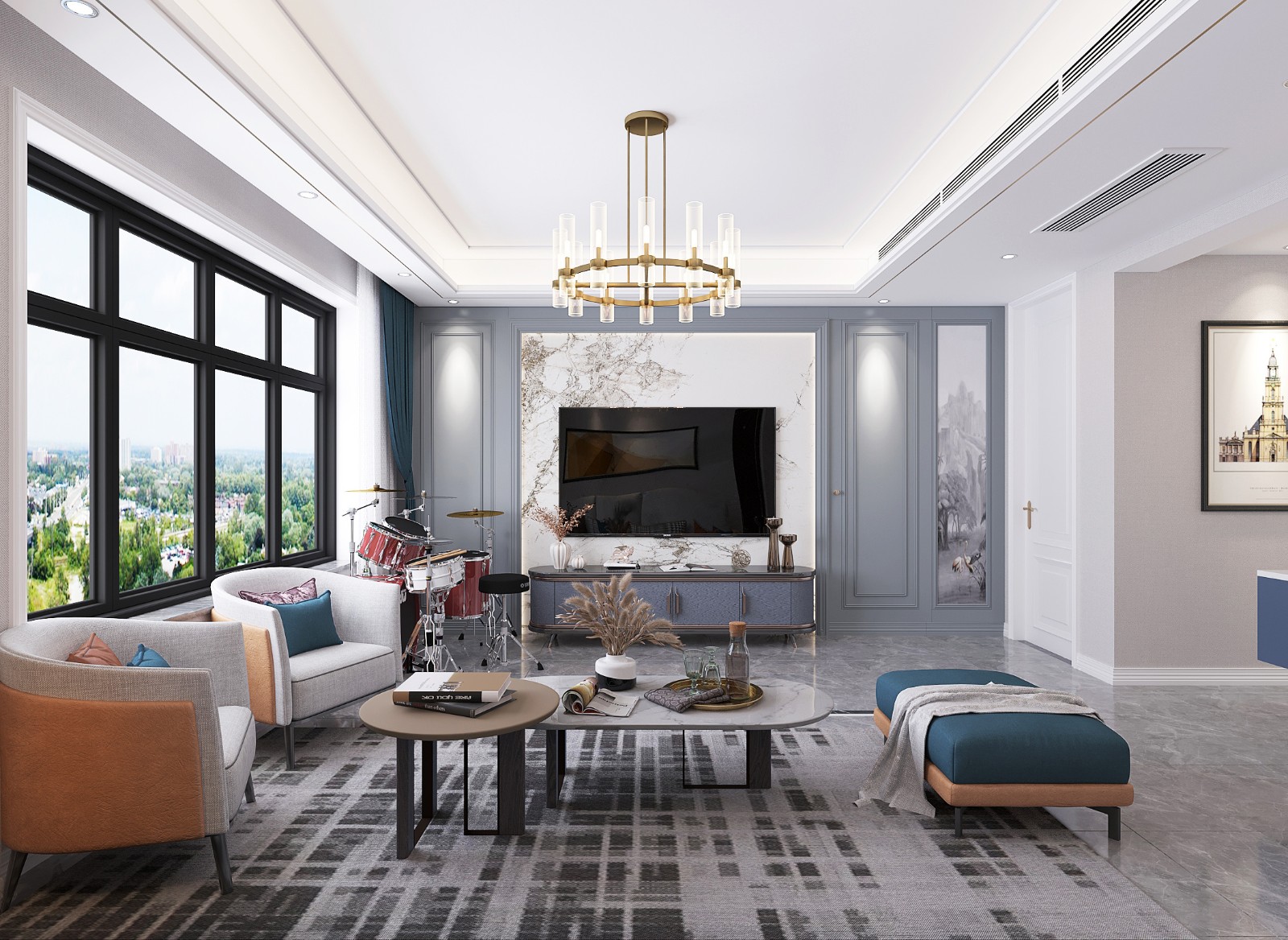 沙发背景简单处理,使空间不繁琐,轻奢沙发,扶手轻薄,不压缩空间。