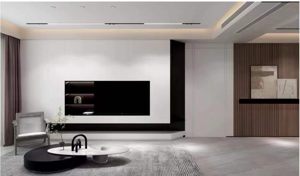 客厅顶面做了一个悬浮吊顶,既有线光源磁吸轨道灯,灯带,又有点光源射灯筒灯