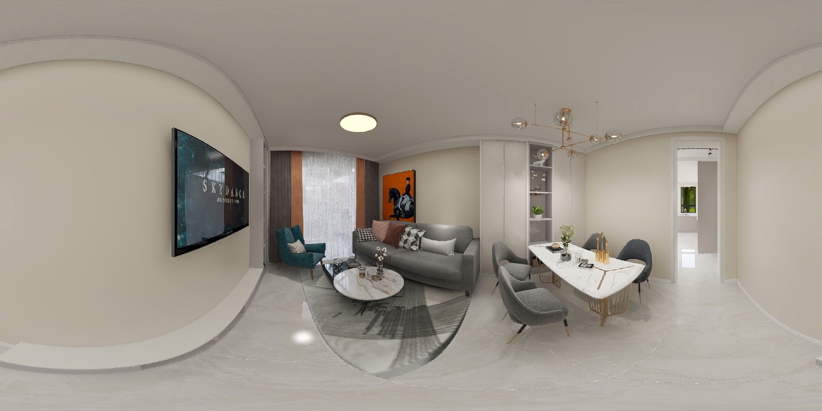 客厅沙发背景墙挂橙色装饰画跟窗帘相呼应