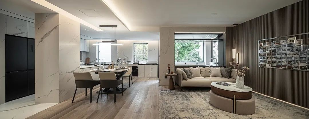 隐藏式衣柜延用了客厅餐厅的岩板,实现了空间的整体性,风格的一致。悬