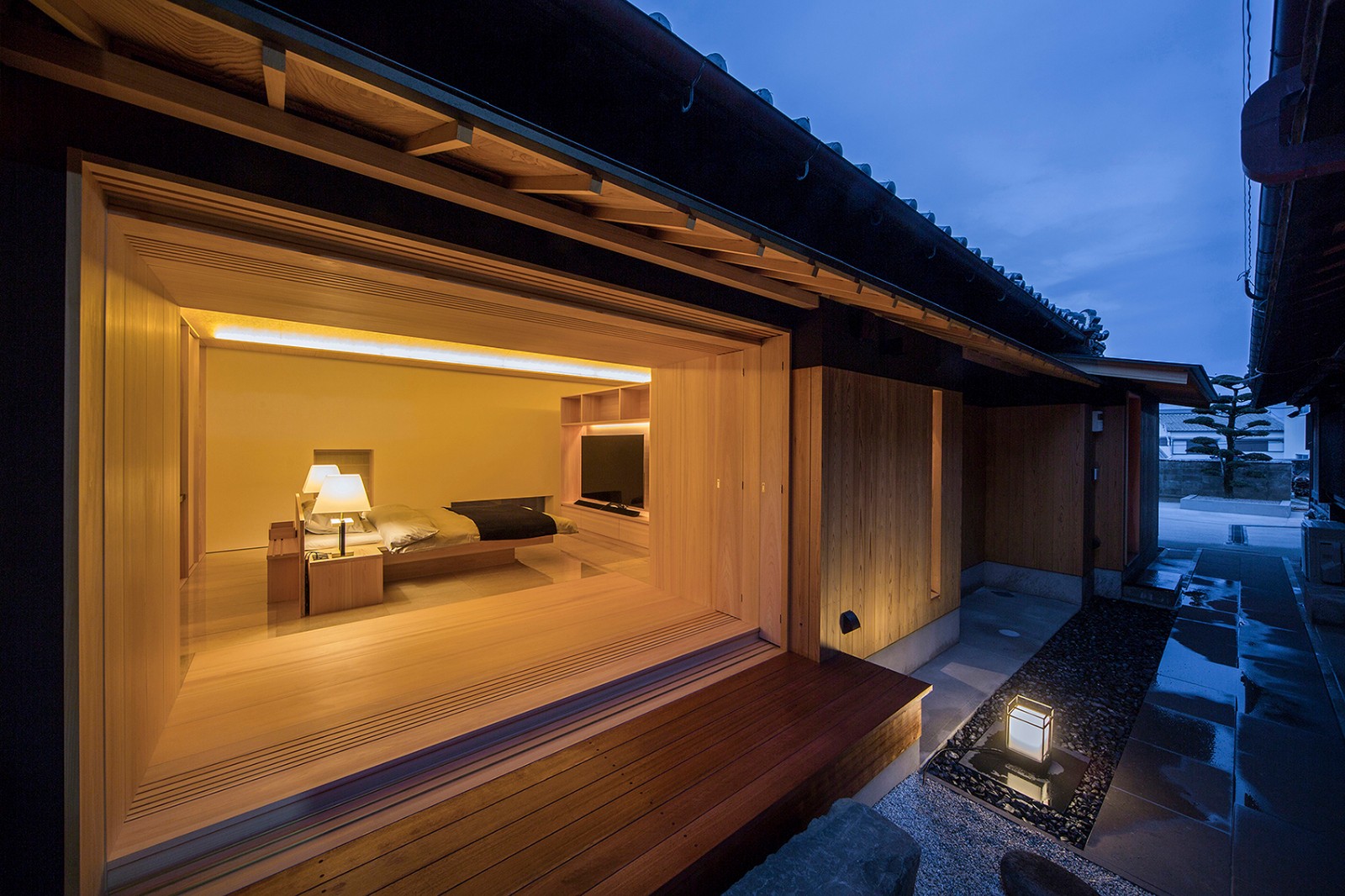 北面的三个窗户 房屋的南侧选择更为开放的设计结构,而北侧窗户则适当地减少阳光的进入。书房内宽阔的窗户被置于书桌的上方,当窗户打开时,可以观赏外面的竹园。 较低的卧室窗户则位于地板附近,以水平方向延伸于地板附近,使居住者能够躺在床上欣赏外部的景观。而另一扇较小的卧室窗则位于床的上方,这个位置恰好可以让阳光透过白色的手工窗纸照进房间内部。屏风、玻璃门和网隔门也置于书房和卧室中,并且都采用通风良好的推拉