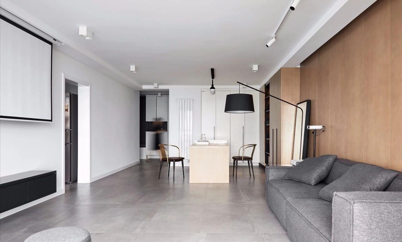 男业主工作比较繁杂,经常会在家中办公,希望有个规整和整洁的家。需要用极简的空间,中和一下繁杂的工作内容,回家后有完全放松的感觉。但是女业主却有超强大的收纳需求,极简和收纳并不矛盾,要在极简的空间中不忘每处都做好收纳规划。整屋色系是黑白灰,增加了一些木色,降低家中灰色的冷冽感,保证收纳空间的同时还要增加通透感。