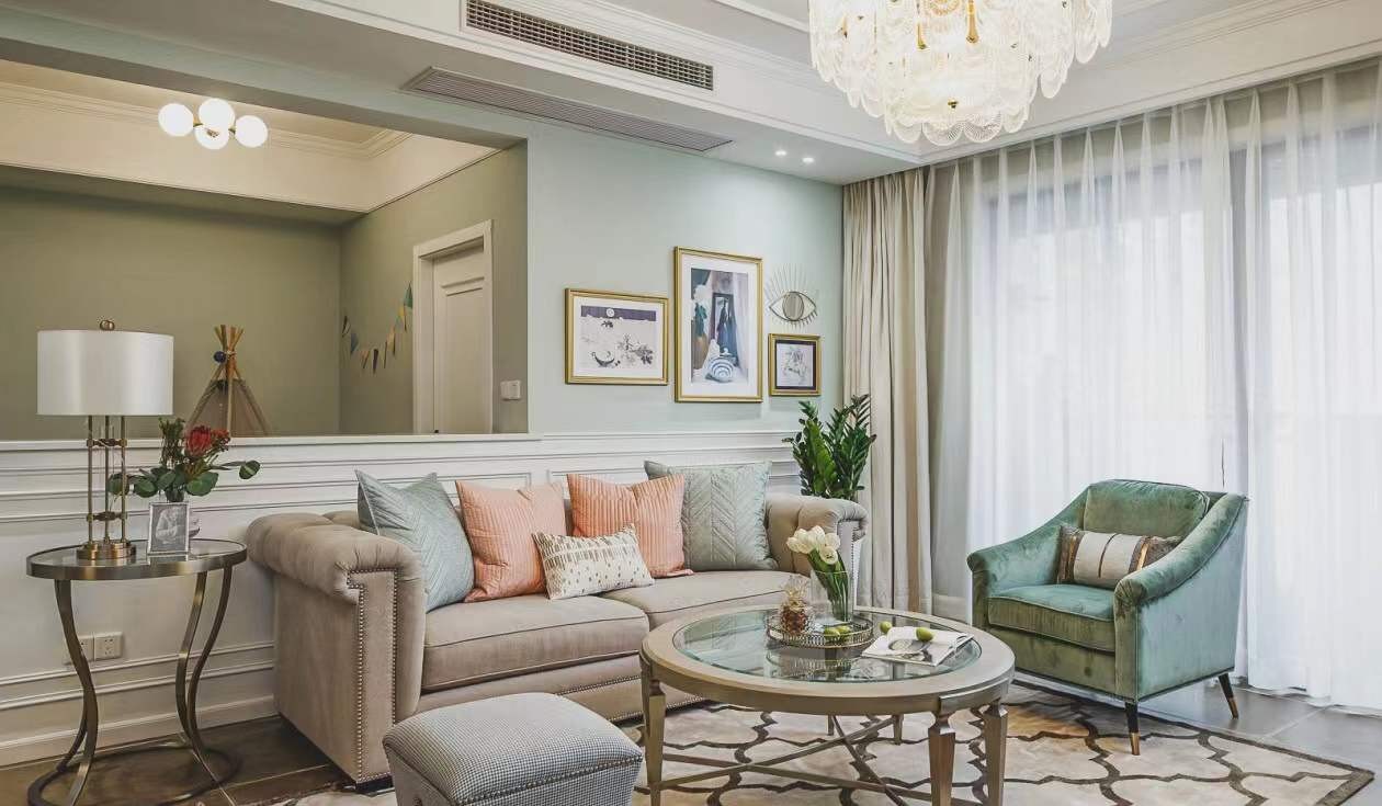 整个客厅舒适而温馨,大地色的地砖和灰绿色墙面稳重而不失清新,加上线条打造的层次感,精致之感扑面而来。