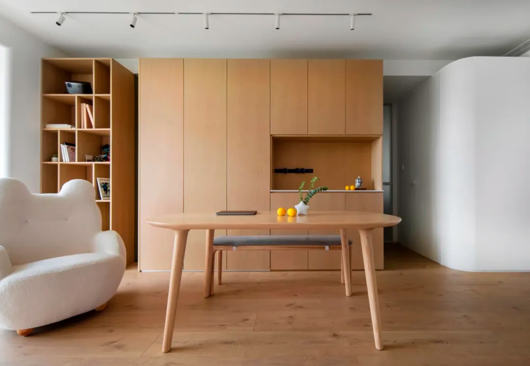 客厅做了不少弧形细节处理,弧形的餐桌、弧形次卧、造型圆润的沙发,厨房墙面转角等。正因为女主人常常一个人在家,用圆润的弧面弱化空间边界感,即使一个人居住也能拉近与家的距离。