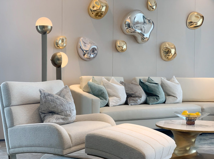 为了整体风格调性吻合,家具选型又反正的改为了又流线幅度的选型,由于现代人生活方式的改变,我们从以电视机为中心改为以茶几为中心,做成圆形的的半包围形式,让整个空间更加的有交流,更大程度的释放空间尺度