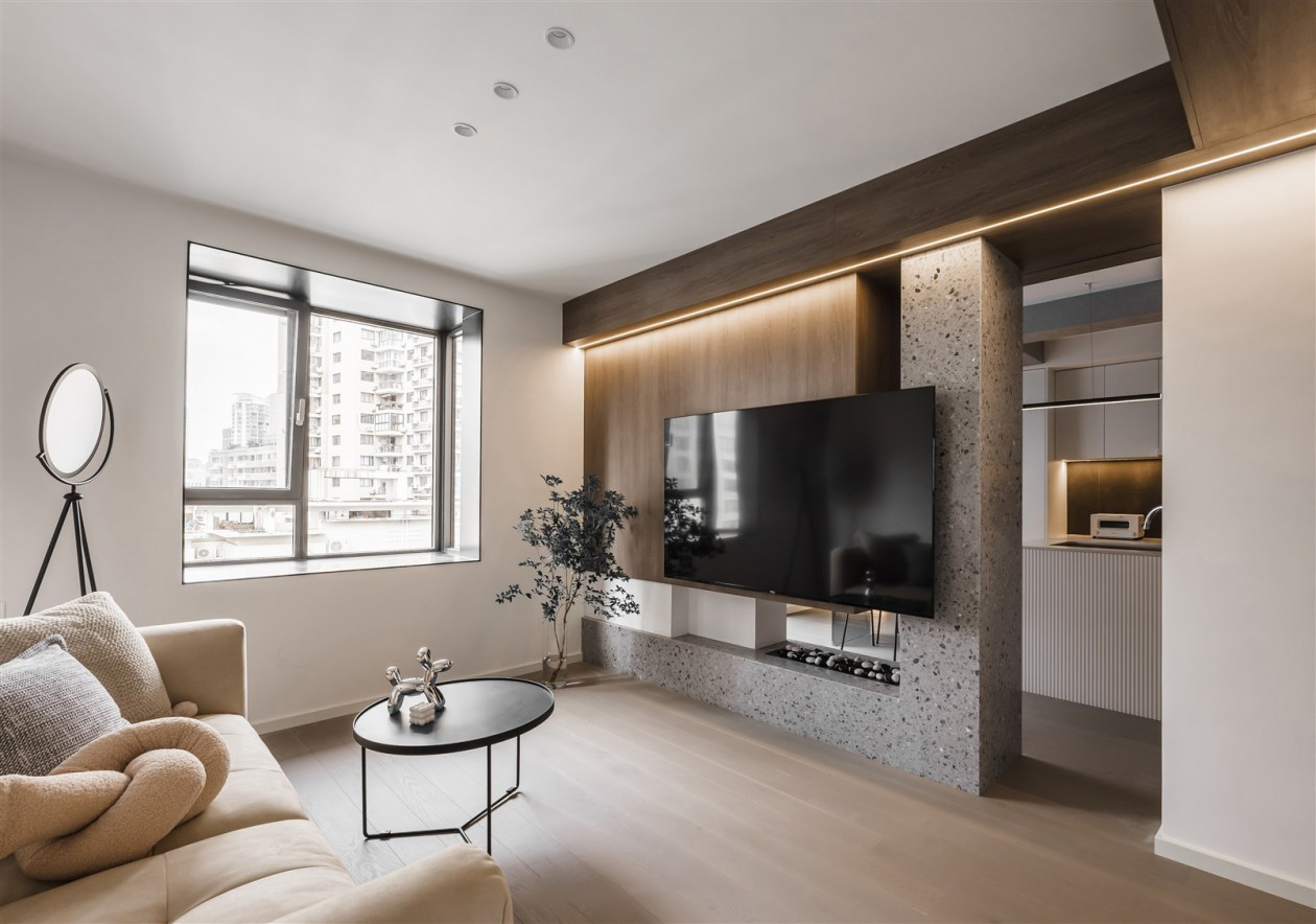 悬挑收纳柜与结构梁体、吊顶,用胡桃木饰面统一装饰,整体性更佳。氛围灯光则选用3500k的暖色光源,让家的温度油然而生。