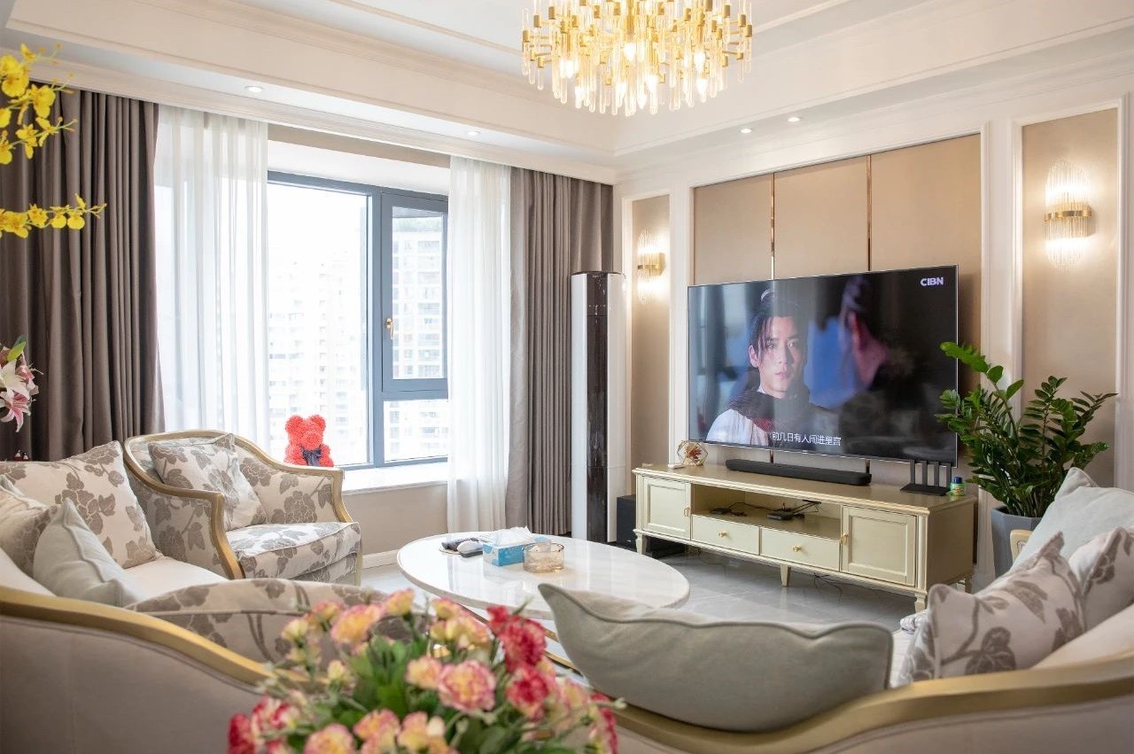 女儿卧则更加精致实用,沿用全屋的轻奢风,床头的软包设计增添了些柔软和温暖。整面墙的到顶衣柜设计充当了衣帽间的功能。