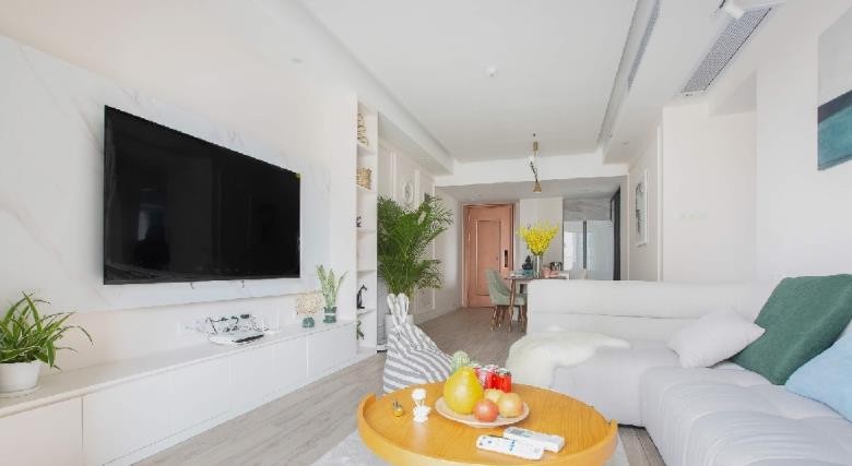 整体色系以莫兰迪色系为主,客厅和主卧是大面积的浅奶茶色为基底色。