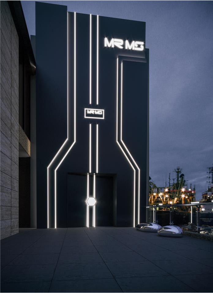 本案例在外墙广告设计上设计师用对称收法做线性灯光的设计,与蓝色墙面想结合,符合当代年轻人的设计审美,从面达到引流的目的。