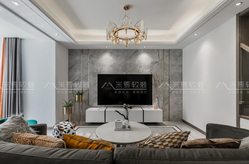 客厅沙发主视角,电视背景墙。