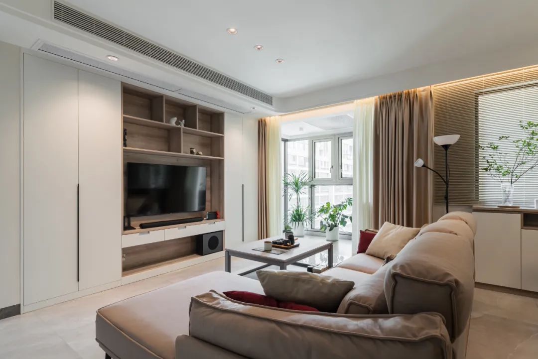 无主灯的天花设计,电视墙以定制收纳柜的组合式设计,两侧是一门到顶的收纳柜,中间是木格开放的电视柜区域,壁挂上电视机,显得简约实用而舒适。