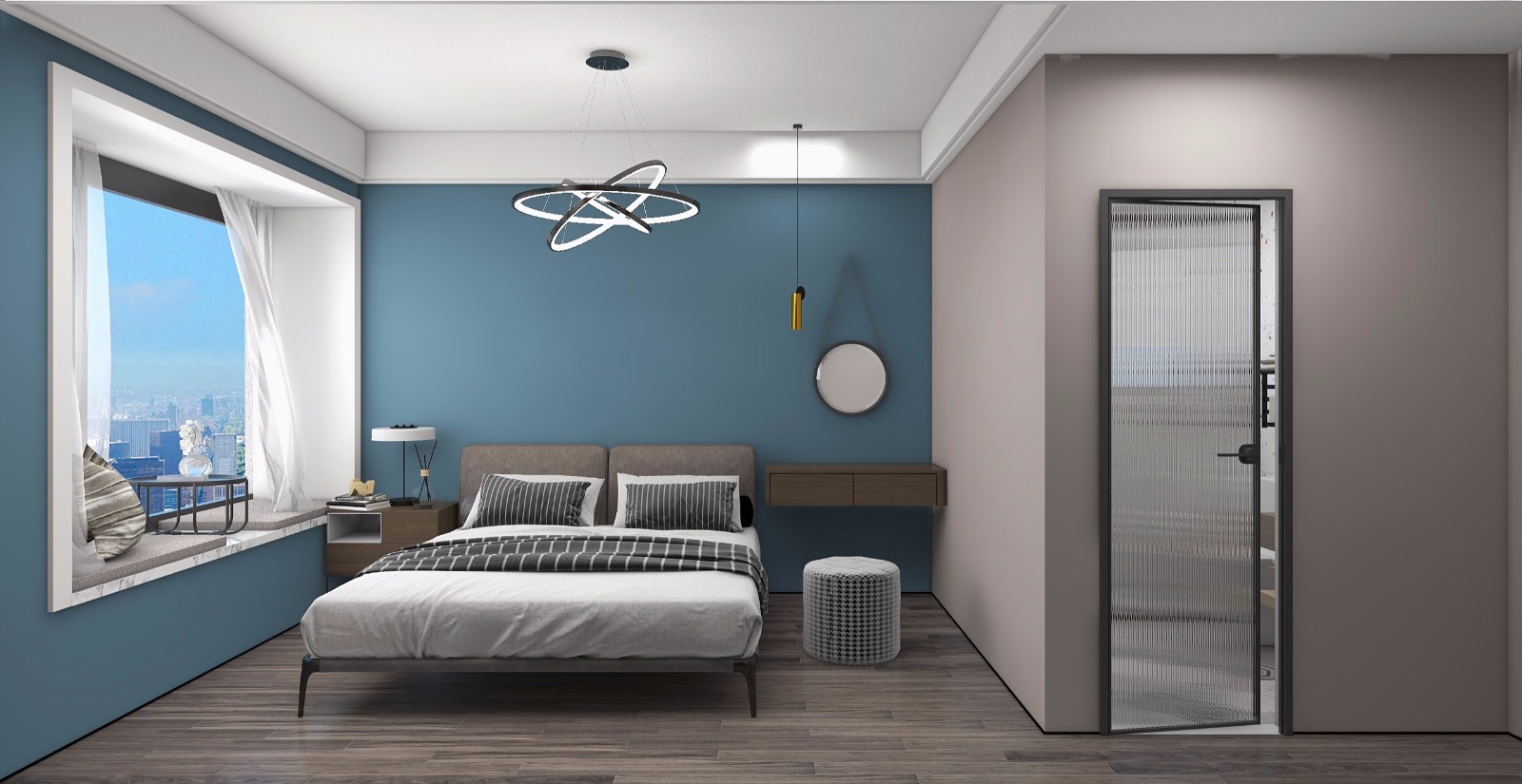 卧室我们没有做过多的复杂造型就是将床头背景墙做了一个分色处理,这样显得卧室也比较开阔