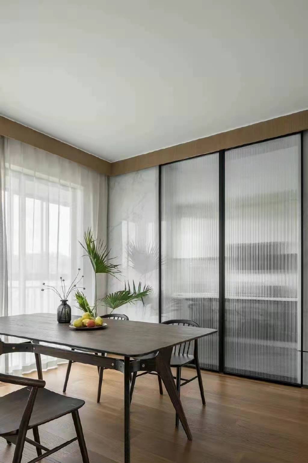 餐桌也是木色系,配上长虹玻璃移门,现代中又不失暖