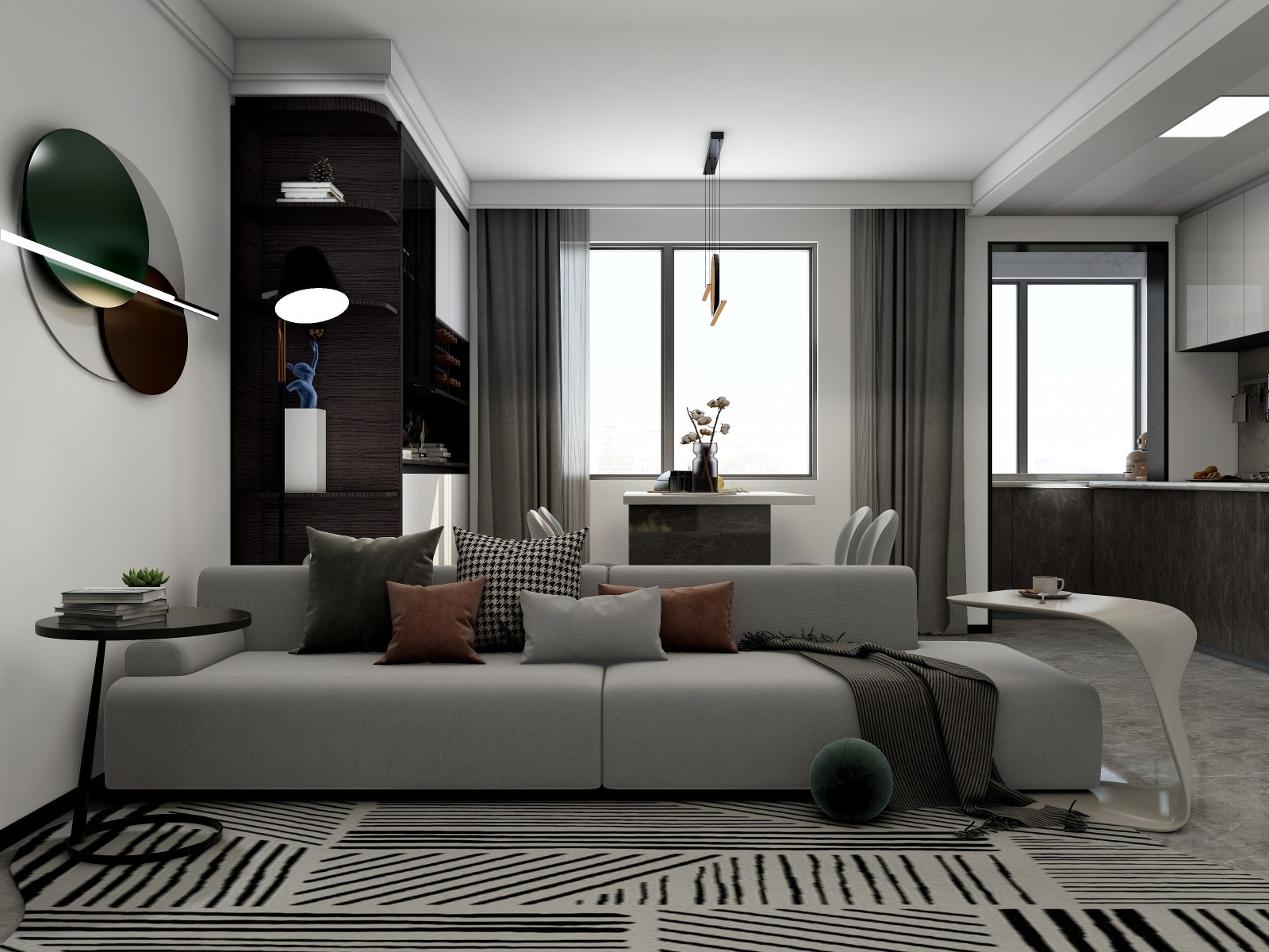 餐厅靠窗户,窗下的位置被充分利用,时尚的旋转吊灯让整个就餐空间高雅又精致。