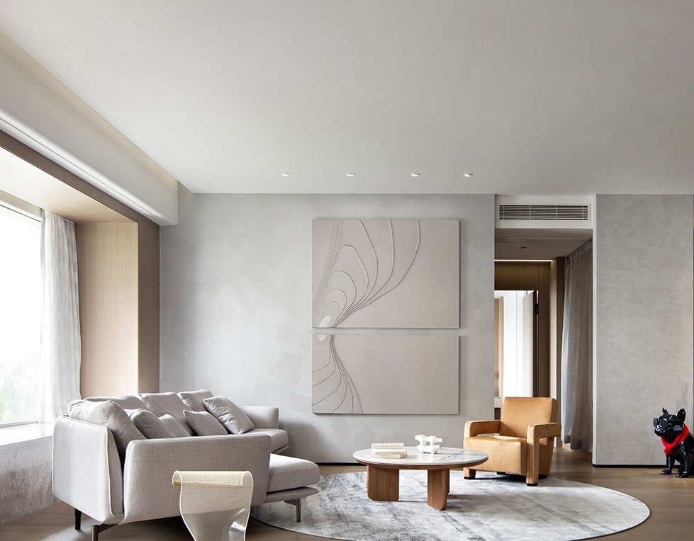 灰***术涂料奠定空间宁静的基调,浅松石绿与淡黄的单人沙发丰富着客厅的色彩感知,以细微处的变动打破沉闷,构建出轻松舒适、愉悦惬意的氛围。
