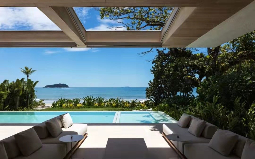 客厅选用了开放式设计,由室内蔓延至室外,给人开阔的视觉感受,丰富了空间的层次。在客厅中可以一览室外的海滩与绿植,增添了空间中的自然气息。