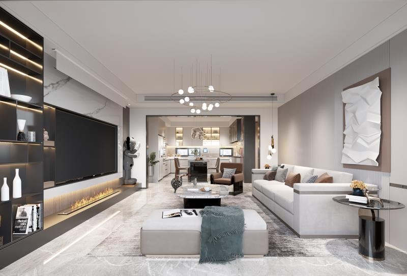 客厅背景墙电视、幕布均保留。整体色调浅色明亮,局部黑色点缀,黑白灰色调设计。