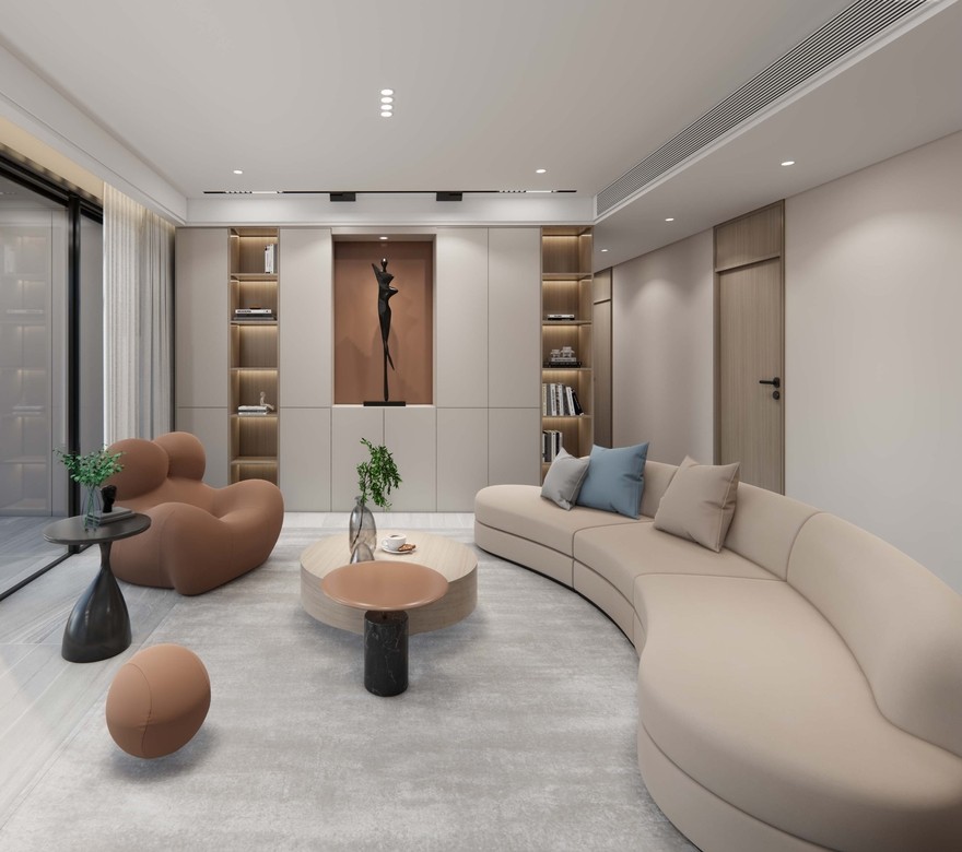 这并非传统意义上的客厅。他没有了电视墙,没有了电视,取而代之的是书架展示柜。家具的摆放都是对向坐。 这是一个会客,彼此聊天对话的氛围,又或者是读书学习的空间。