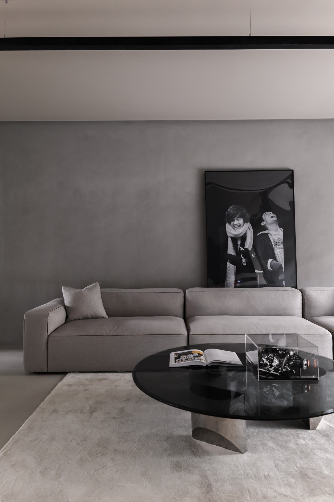 沙发墙面原本打算用石材分割,但因铺装毛细管空调,只能换成单色的微水泥饰面,用生动的巨幅画作打破单调,黑白配色无碍空间表达。