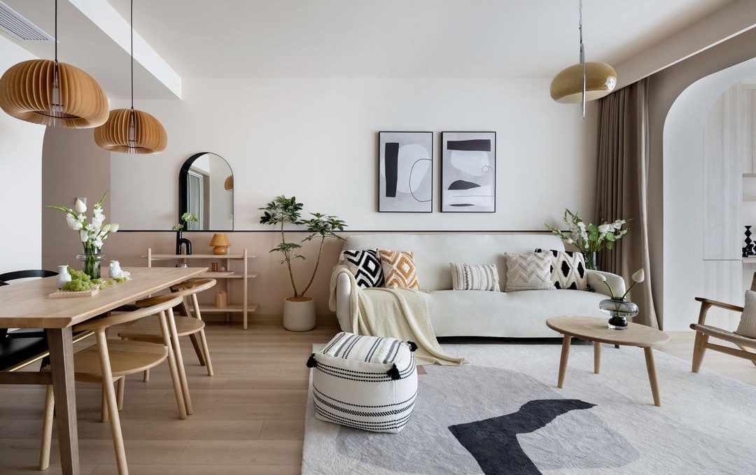 圆润的弧线,柔美的氛围,淡雅的色彩,这一切都让人充满了浓厚的治愈感。色块简洁的挂画给宁静的空间增添平衡感,动静相互制衡,有条不紊。