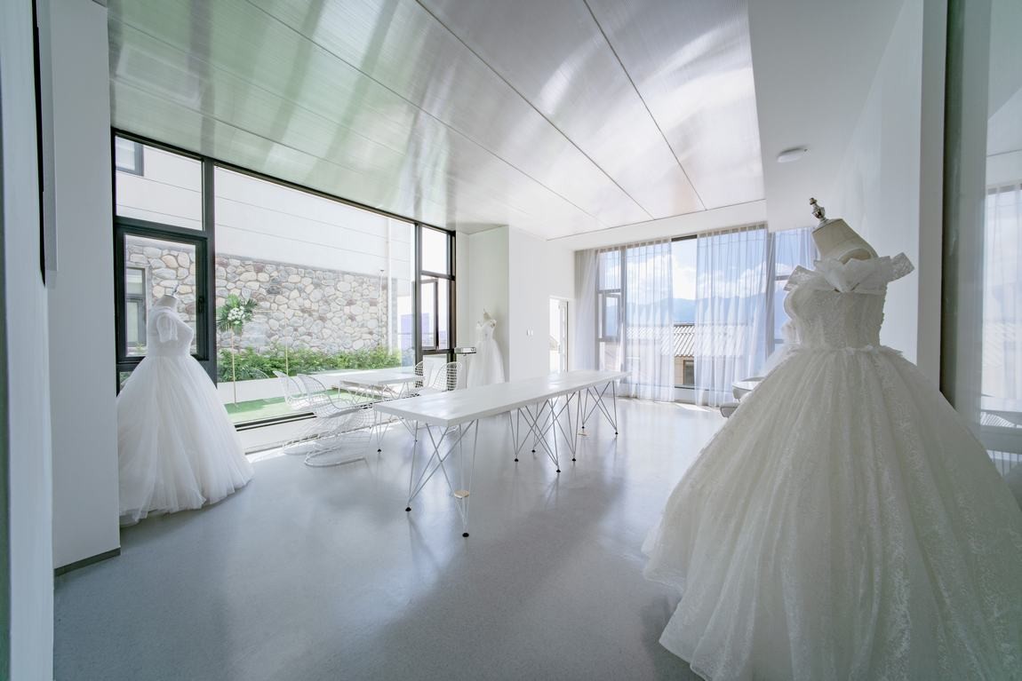 公共空间的设计通过尽可能塑造出的纯净超现实场景来唤醒使用者深藏心底的幻想。公共空间由白色墙面、浅灰色略带反射的地面,以及几近朦胧的阳光板营造出纯净、***氛围。作为主空间仅有的几件家具与婚纱,仿佛博物馆中的几件展品,营造一种空灵的效果