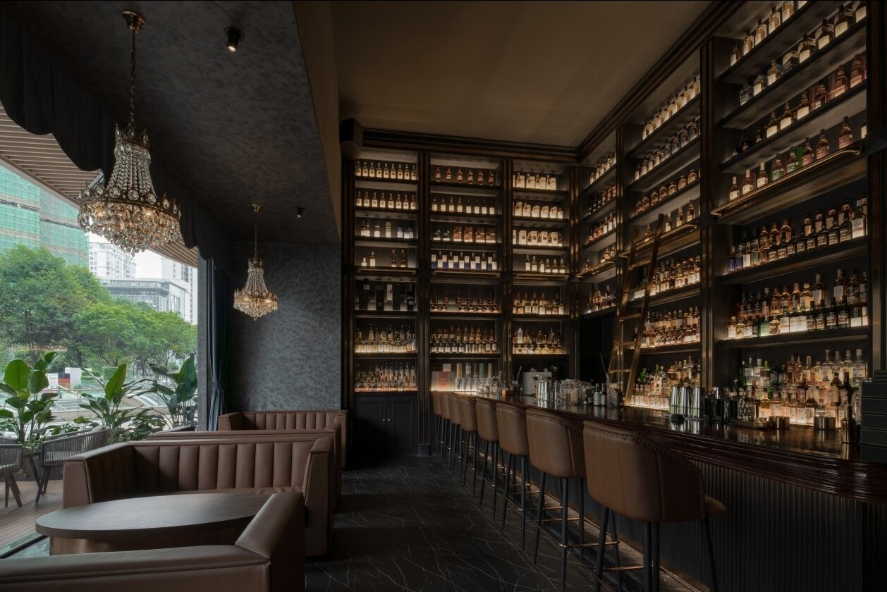 半遮挡的弧形墙面,将视线引入空间主题,阵列的酒品存储于高挑的酒柜中,分布散落各处的座位围绕酒柜展开。 错落迷宫般的墙面将卫生间隐藏于楼梯旁及下部的角落空间。 向上的楼梯引向较私密的包间及单座区域。