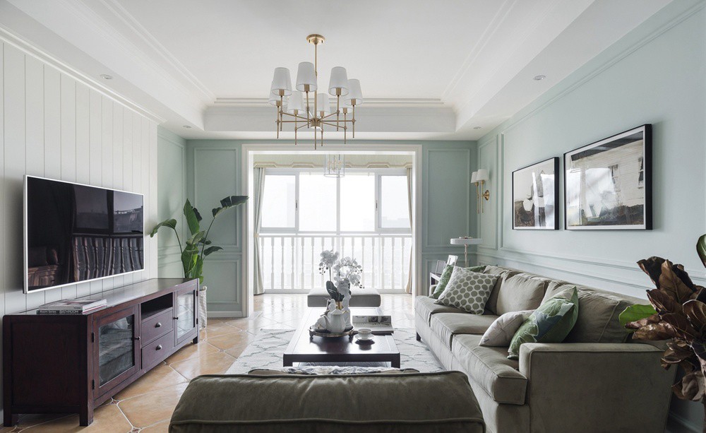 客厅主色调为青绿色,有着法式独特的石膏线条,客厅地砖选用好搭理不显脏的黄色的大理石拼花砖。