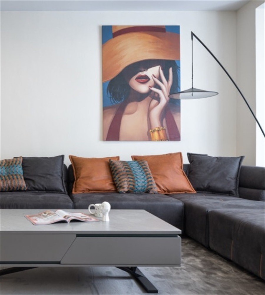 不论是色彩的搭配、家具的造型都以现代简约沉稳为基础,偶尔的跳脱,营造出无压、放松的空间感受。客厅是无主灯的布置,只有射灯的照明突显简约大方的氛围。