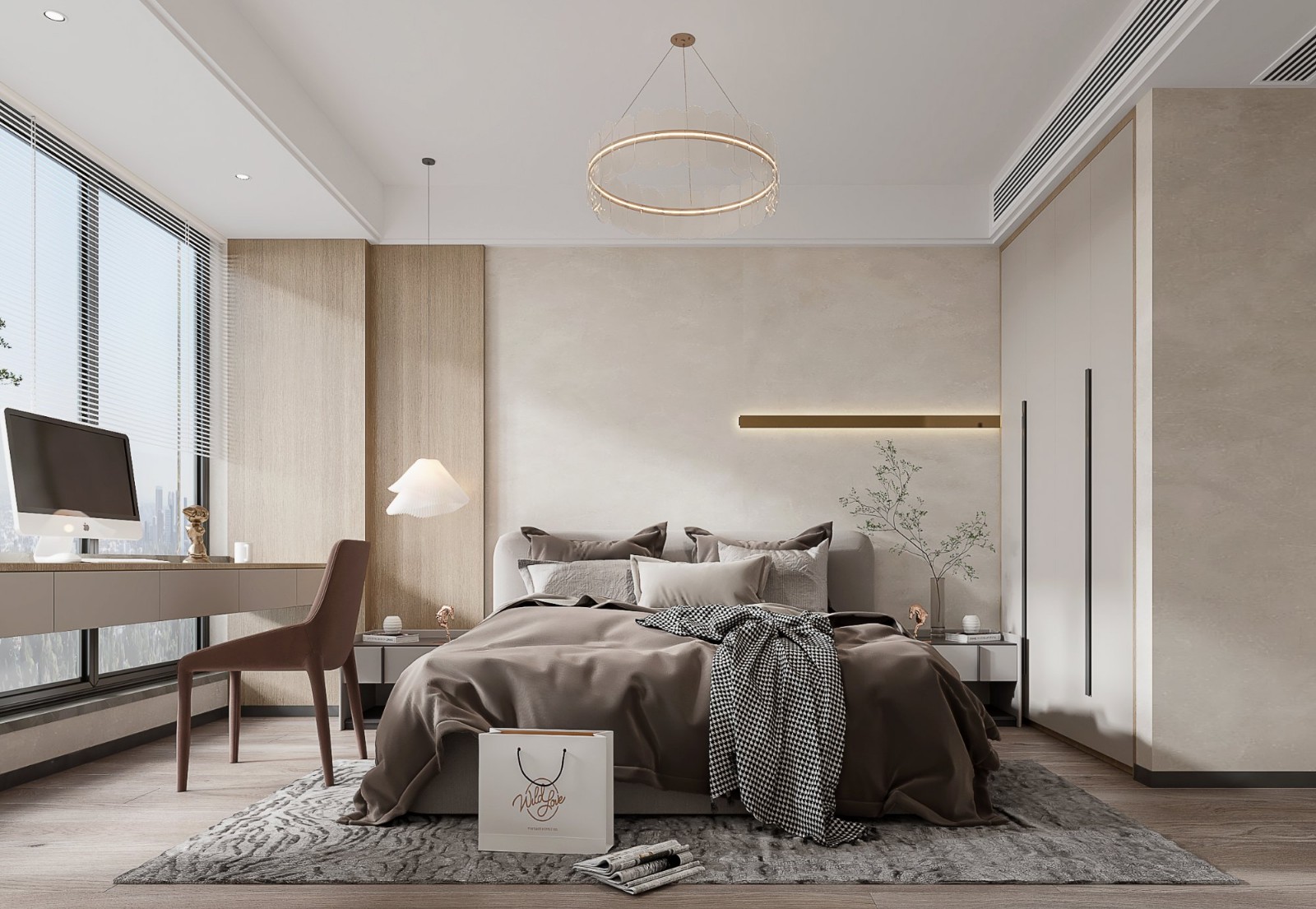次卧以灰色+原木的硬包设计,墙上还设计了一排暗藏灯,床的一侧是一大排衣柜,另一侧靠近玻璃的一边,设计了一个书桌。整个卧室洁净自然