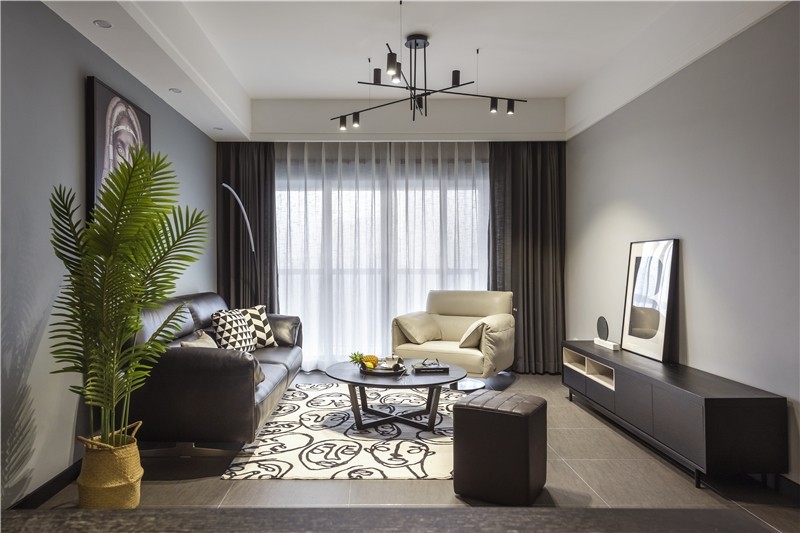 黑色电视柜和客厅吊灯相辅相成,搭配上素雅的窗帘,一点点的绿植,让整个空间大气、沉稳,又不失温馨。