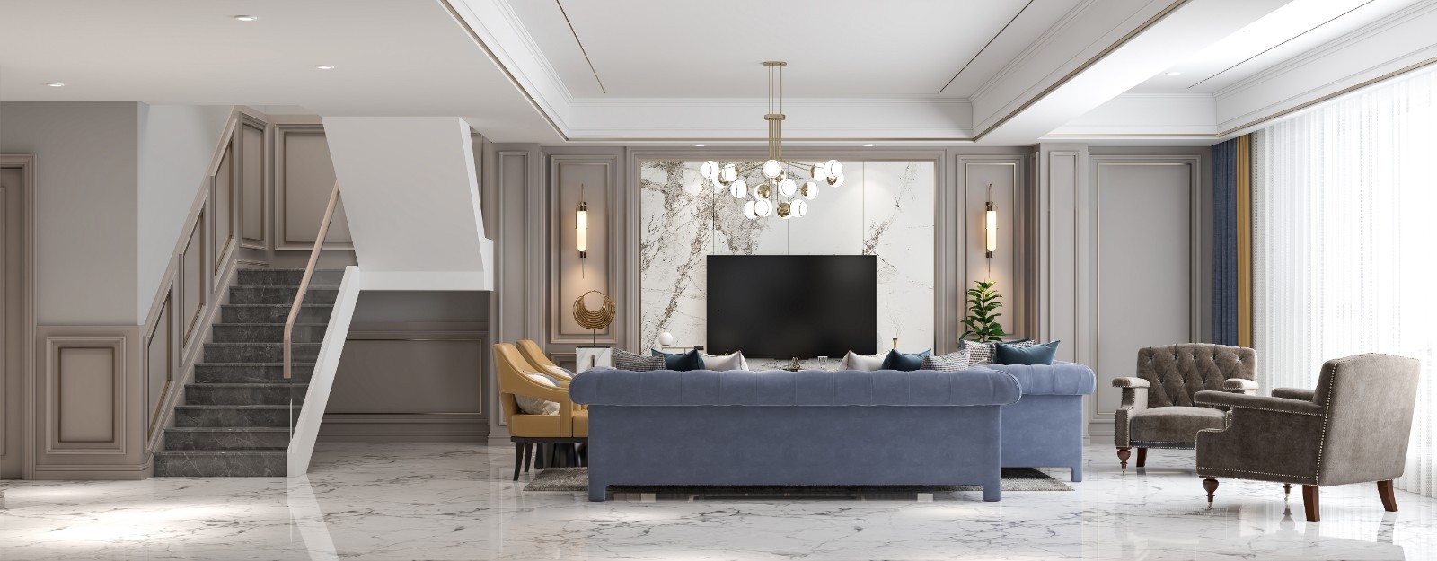 对称的石膏线条和岩板电视背景墙形成强烈的视觉冲击。