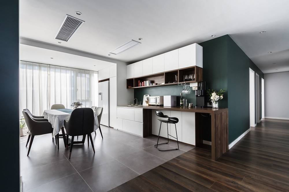 牛油果绿与白色拼接,餐边柜满足收纳和小件电器收纳的同时,设置小吧台便于品咖喝茶,木质纹理的吧台与地面色系融为一个整体,让空间有划分又巧妙融合