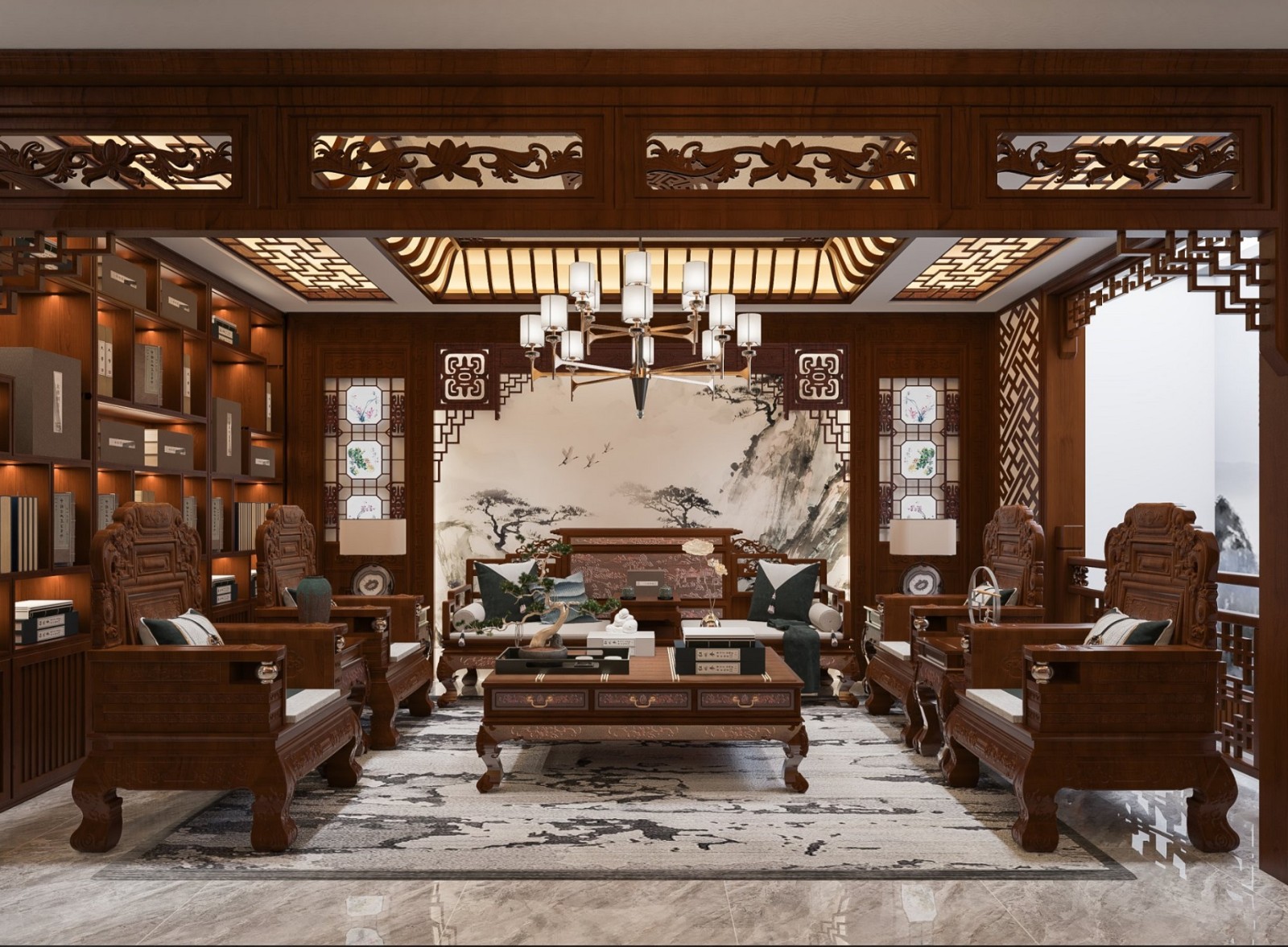 卧室空间也是作为古典中式的方式来做,侧边因管道问题做了特殊的内凹柜体处理