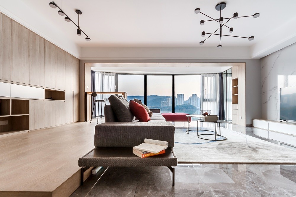 利用原有空间的阳台采光江景,形成一个落地窗,将亲子互动区域和休闲区域很好的融合,让一家人可以很好的互动沟通