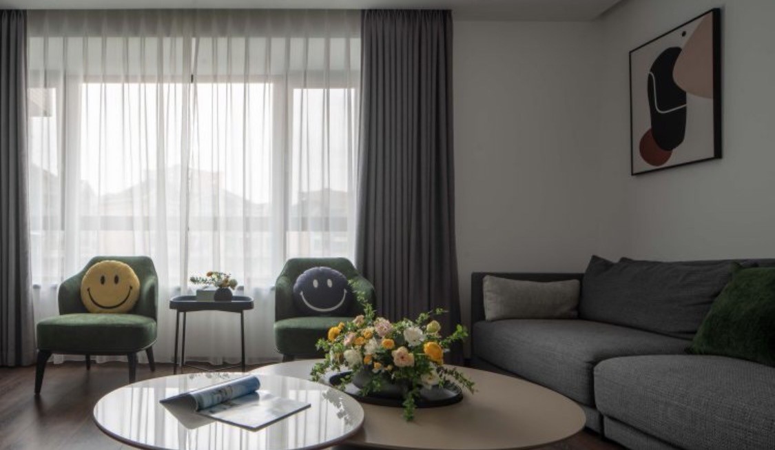 自一楼延伸至卧室的大面落地窗,成为自然的讲述者。柔柔的光、浮云流动的天、绿荫婆娑的树、若隐若现的城市,像自带魔法似的框出一幅最动人的画。