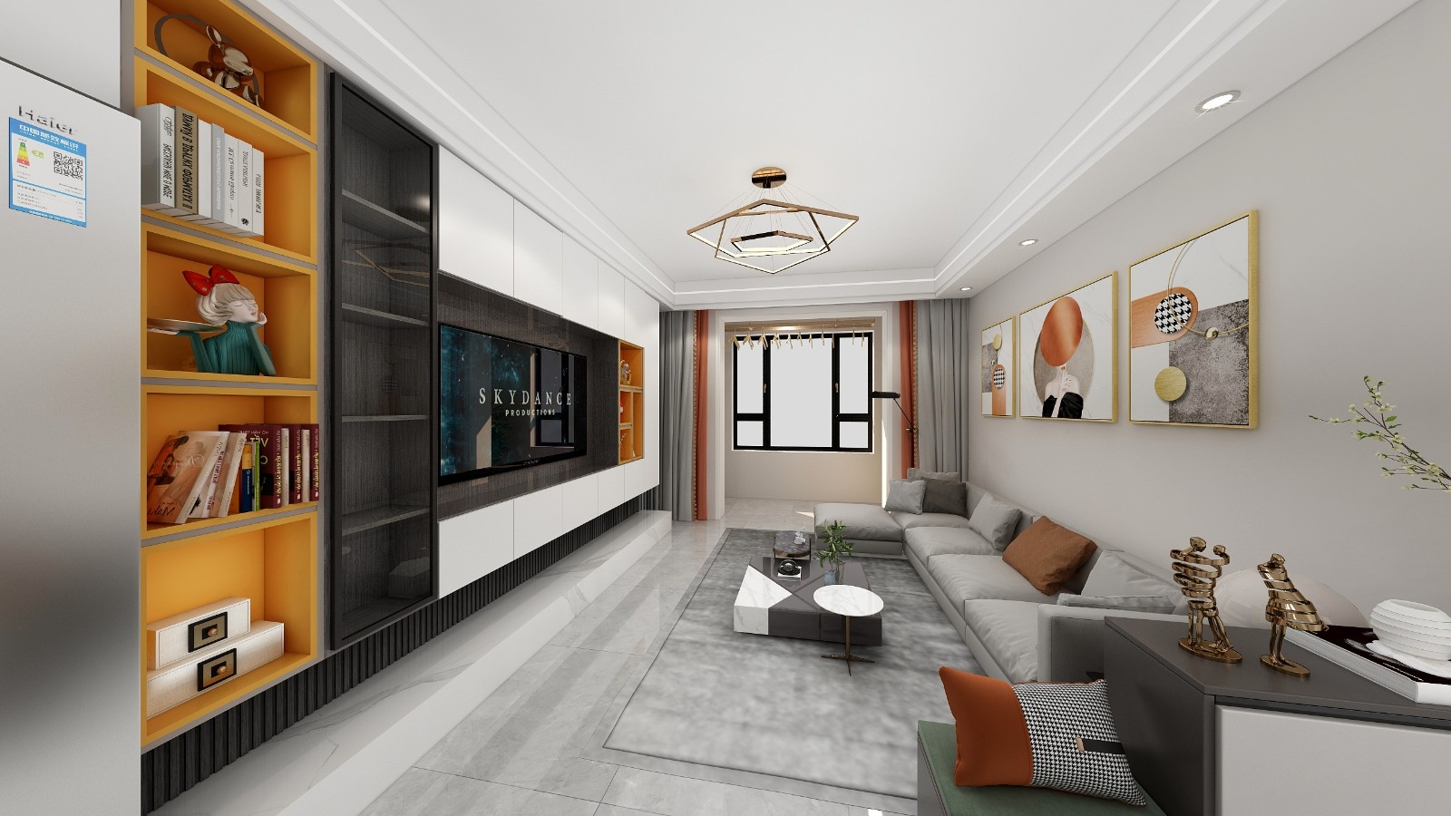 客厅电视墙整体做电视柜,定制地台,边上做嵌入式冰箱。