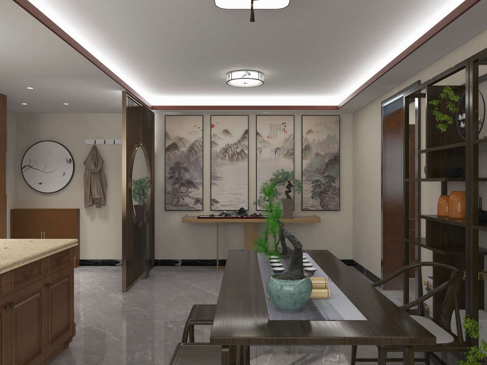 业主喜欢书画,平时喜欢写毛笔字画画,通过和业主的沟通确定装修风格新中式,没有传统的客厅,餐厅,一切随性随缘的设计。