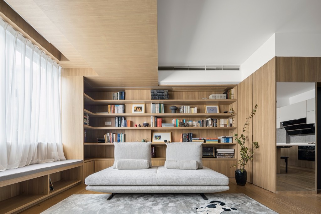 环绕整个空间的书架与储存柜体一起形成整个空间的包围感。视线在整个空间并无死角。