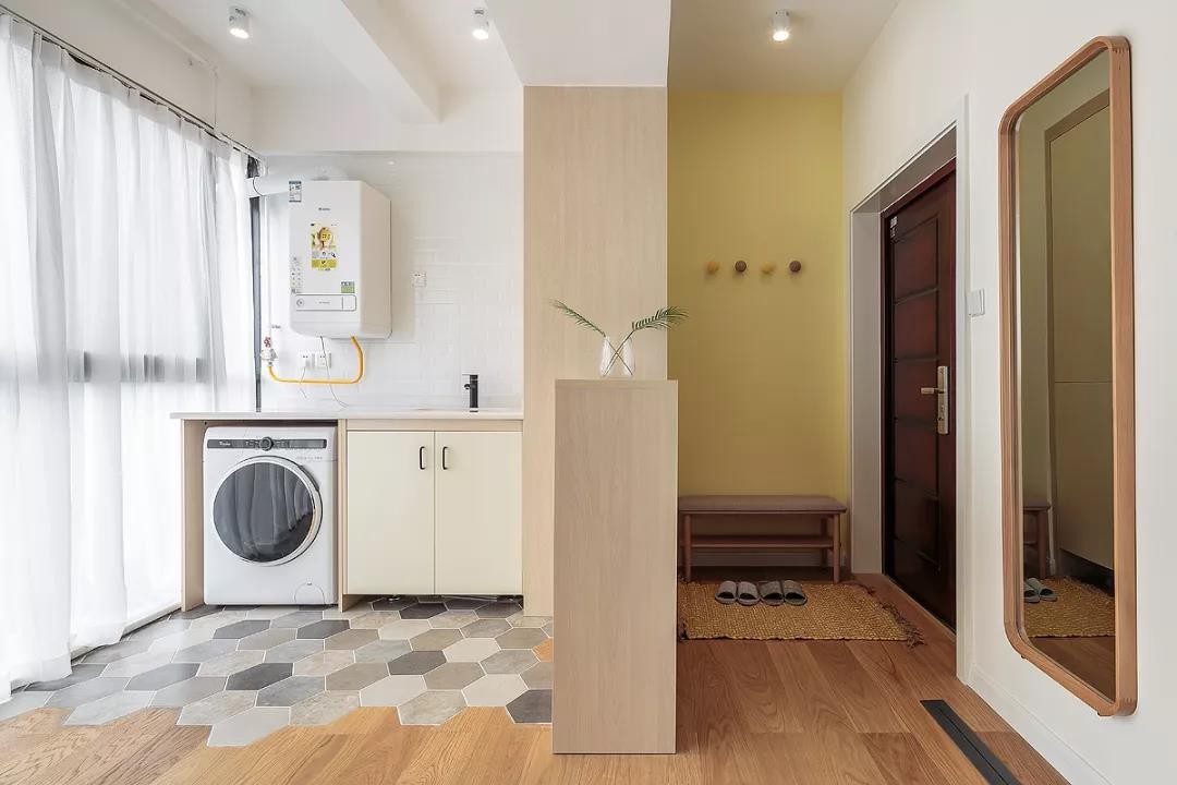 入户的玄关走廊是和洗衣房连通起来的,为了避免水汽的侵蚀,在洗衣机和洗手台处铺贴了文艺的六边砖,洗衣房的另一侧做了到顶的柜子。