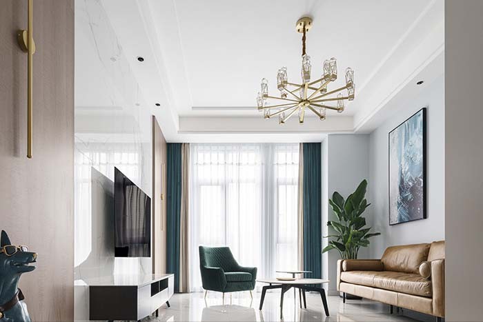 电视背景墙设计师是按照近几年比较流行的轻奢风格来花心思设计的,以大理石和木饰面做装饰,木饰面上方考虑了黄铜材质做点缀,瞬间让轻奢感凸显出来。