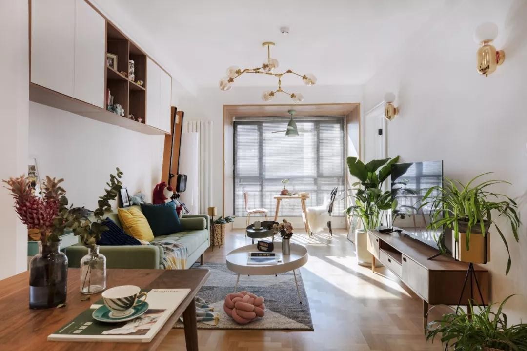 客厅色调以绿色为主,以黄、蓝、粉为点缀色,添加了铜元素和木制品。客厅的软装单品都是采用了一些比较简单典型的北欧搭配