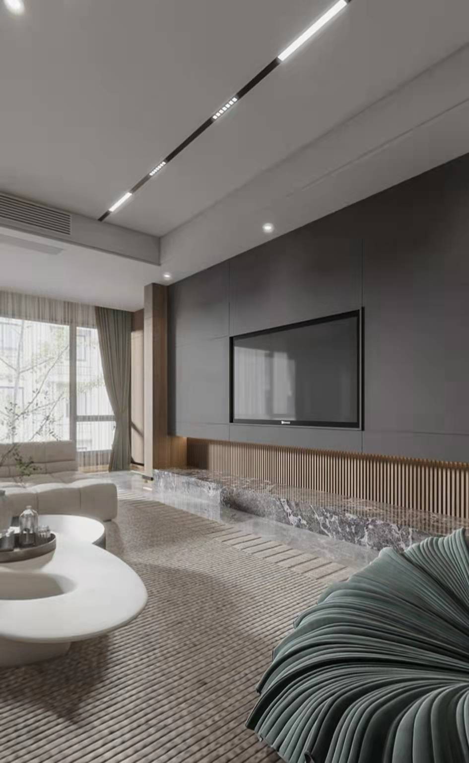 沙发背景墙呼应电视墙做的护墙板造型