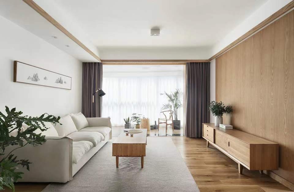 客厅电视背景墙没有过多刻意的造型,化繁为简 清爽干净,阳台摒弃原有的推拉门,显得客厅更加宽敞,摆上绿植俨然成为秀气一角