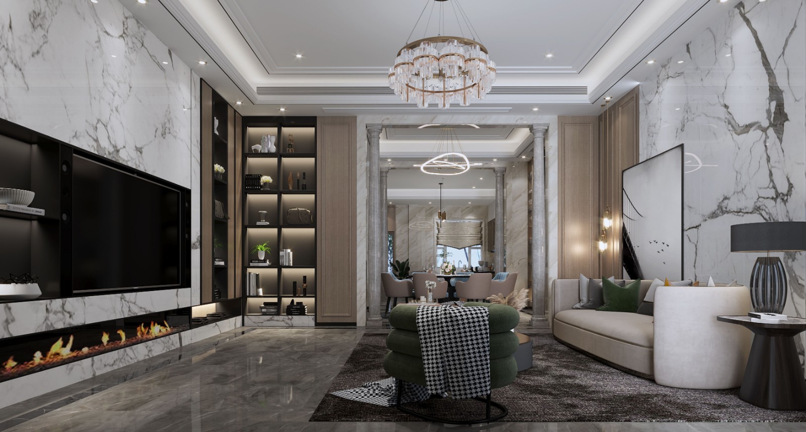 客厅空间简洁大方的硬装,舒适质感的软装搭配,融入丝绒和金属的元素,整体给人的感觉是简约而充满质感。