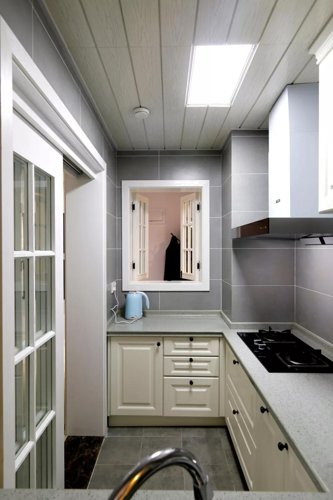 厨房和餐厅之间用玻璃推拉门隔开,避免油烟的问题。设计师还在玄关和厨房之间做了一个室内窗的设计,把两个空间连通,更显宽敞。